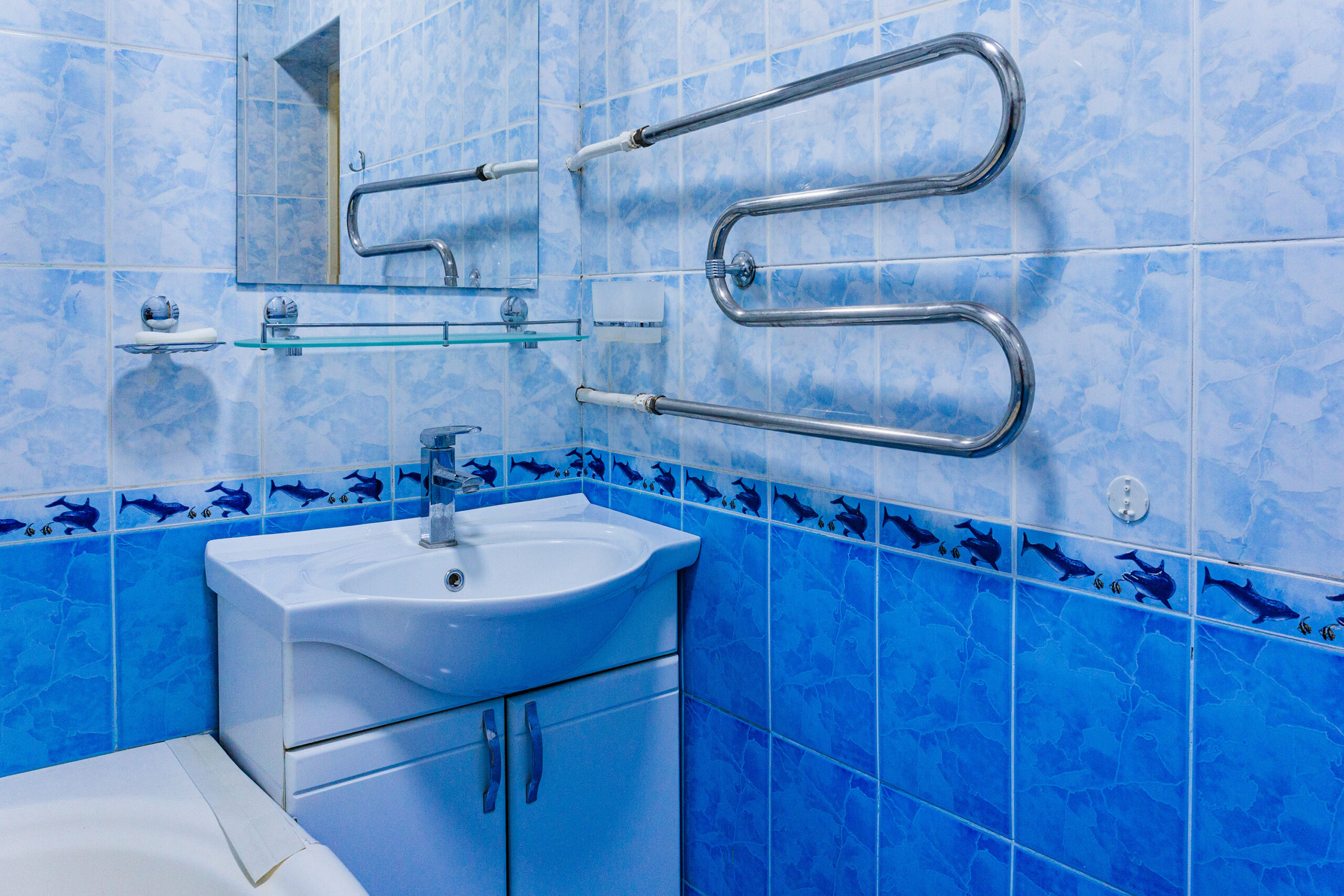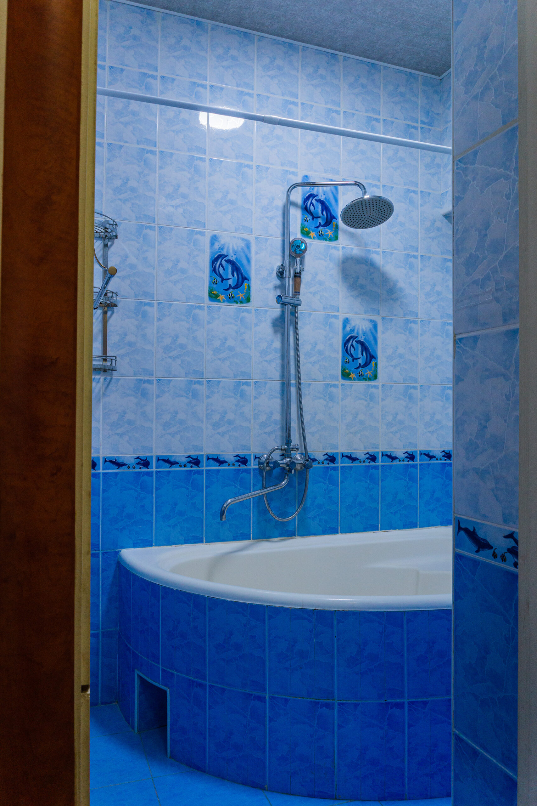 | Ванная комната | Ванна с душем, шкафом, зеркалом, полками и полотенцесушителем с характерным оформлением в синих тонах с плитками изображенных на них дельфинах |